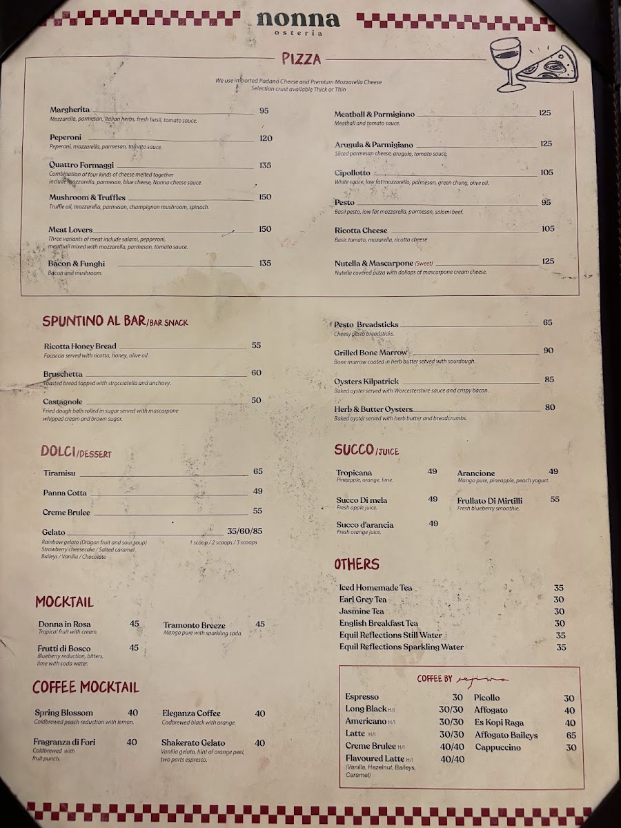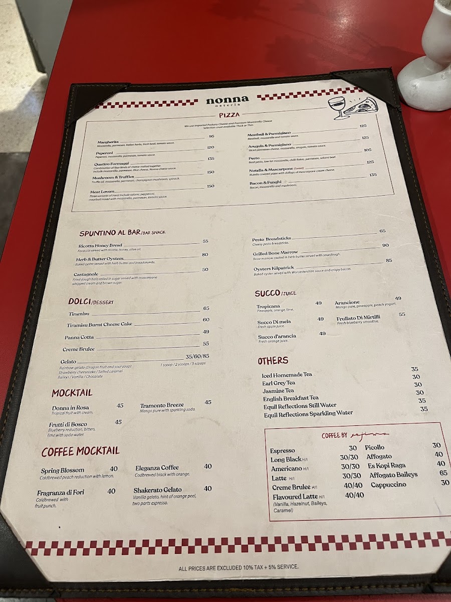 “ I was craving for pizza and the google photo looks good. So we decide to visit Nonna osteria for the first time on 9th Oct. We honestly enjoy the food especially the pizza as im always a fans of Napoli style pizza with good crust. The pasta is also serve al dente with good pomodoro sauce. The pumpkin soup was also good. However the biggest let down was the service. The waiter doesn't seems to bother. Doesn't clear the plate after the soup is finished and also never asked about how's the meal. Except that one lady that I believe was a trainee. She seemed to do her basic job well. I would definitely come back for the pizza. But I do hope the front of house staff been trained well and show a bit of care on delivering atleast a decent basic service. Good food with bad service wont go too far. I do hope you take this feedback in a positive way. Wish you luck. Saiful @KakiMakan ”