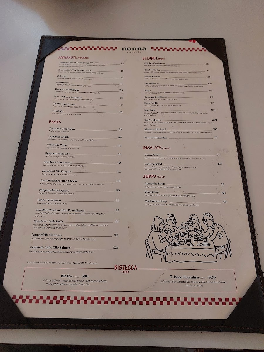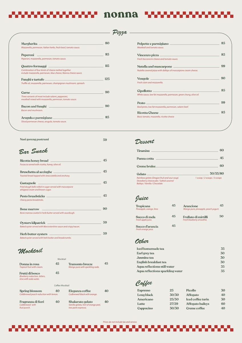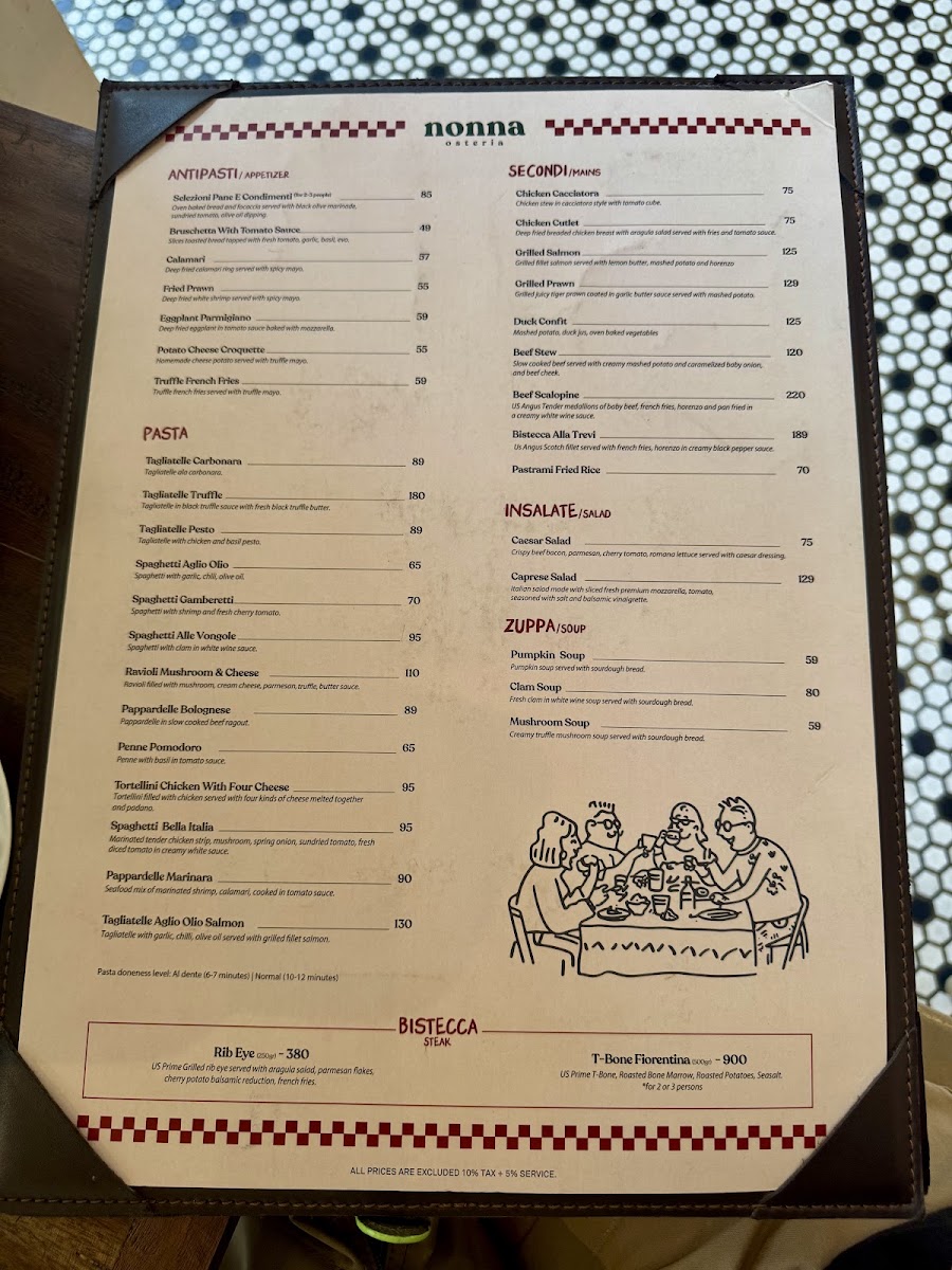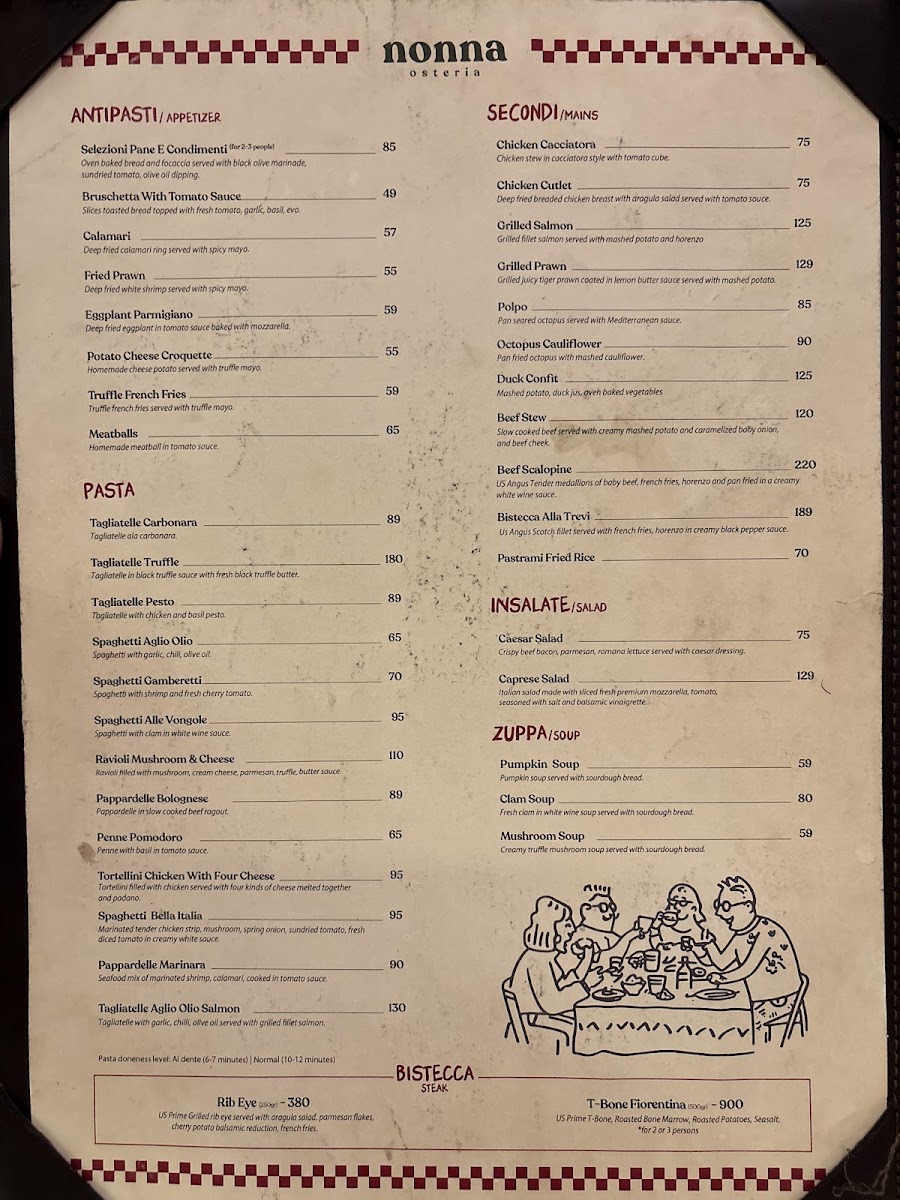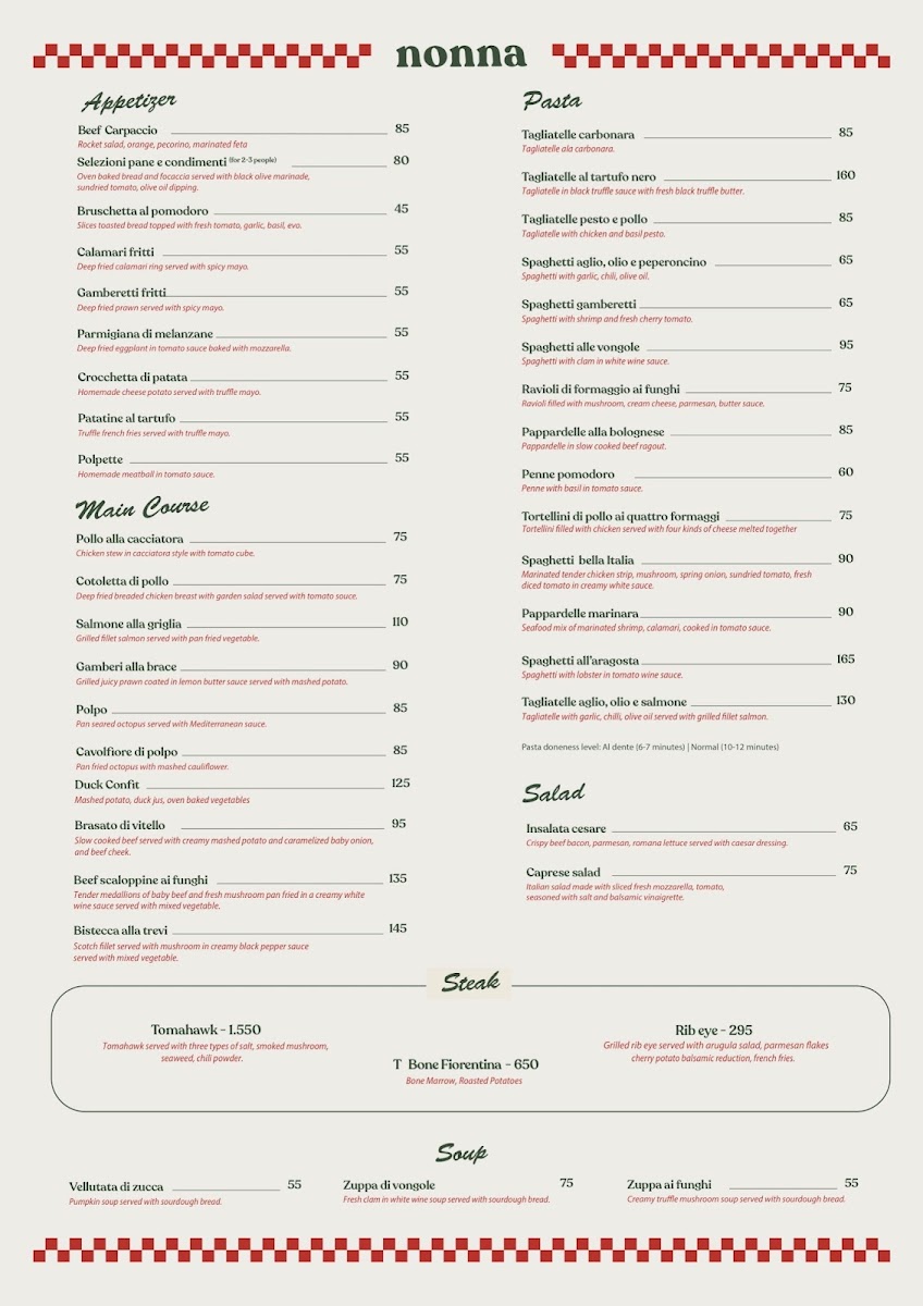 Welcome to Nonna Osteria, an authentic Italian dining experience nestled on Jl. Progo No.37 in the heart of Bandung. This charming eatery invites you to indulge in the rich culinary traditions of Italy while enjoying a cozy ambiance that feels like home. With a menu that focuses on classic dishes, Nonna Osteria prides itself on the quality of its ingredients and the craftsmanship that goes into each meal.