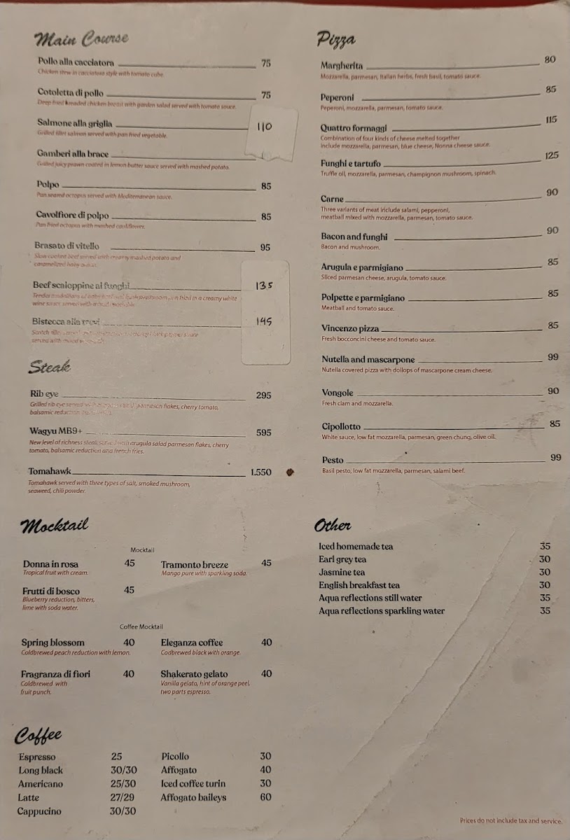 “ It was a Wednesday evening and rain was pouring. We had the whole restaurant to ourselves for the first 30mins. Despite us being the only customers at the time, as we entered the tall glass door, we were warmly greeted by the attendants who were patiently waiting for people to come. You’ll get the standard service as expected, but the welcoming energy from the staff members makes you feel like you can come in. One extra point that needs to be pointed out is the fact that without us knowing much about the restaurant, we were offered their hari kemerdekaan promotion, which was thoughtful of her, since the prices were a little steep imo. Regardless, the food came out super quick and fresh. Despite how “boring” the food was presented, the quality was superb. Pasta was fresh and al-dente. Pizza was cooked perfectly. The quatro fromaggi pizza stood out the most for me since it’s quite difficult to find pizza with “real cheese” around the area. The penne and spaghetti didn’t really stand out, but it was still delicious. The meatball pizza could use a little more of meat on it. The decor of the place was a little too overwhelming imo. A lot of artwork and prints and whatnot. Some pieces of art were out of place. I couldn’t seem to get what the “identity” of the place was. I expected the place to be a little “toned down” a notch, judging from the name itself. Overall, the experience was enjoyable. Fun little spot to eat pretty good italian food. Special mention to our servers and staff members involved. Grazzie! ”